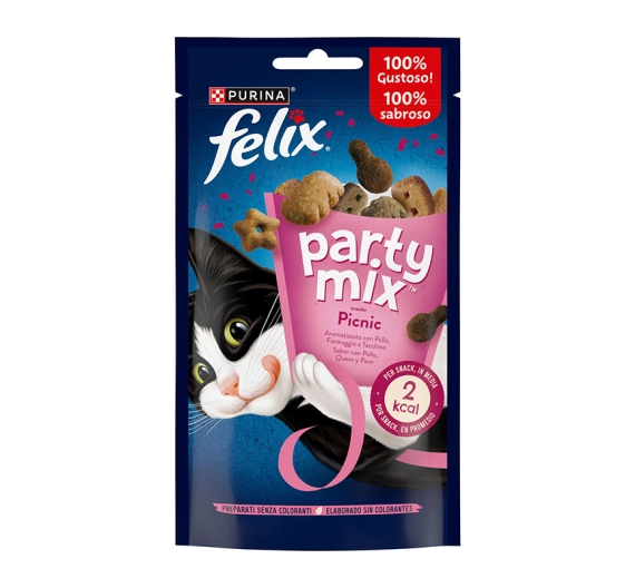 Κάθε σακουλάκι Felix Party Mix περιέχει πρωτεΐνες, βιταμίνες και Ωμέγα 6 λιπαρά οξέα, χωρίς πρόσθετες τεχνητές χρωστικές, για να βοηθάει τη γάτα σας να ζει μια υγιή και ευτυχισμένη ζωή.